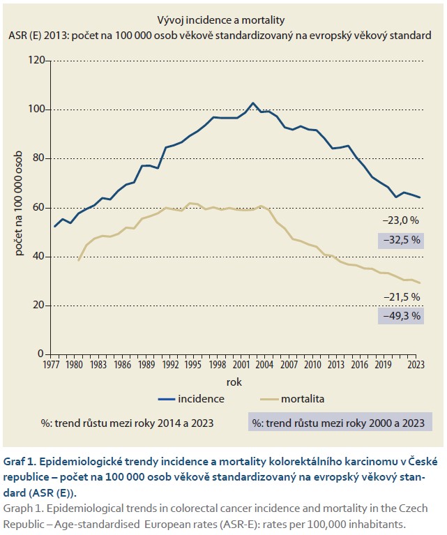 Dlouhodobě dochází ke zřetelnému poklesu incidence a mortality KRK. Od začátku fungování programu v roce 2000 došlo k poklesu incidence o 33 % a mortality o 49 %. Podrobný vývoj epidemiologických trendů KRK v čase znázorňuje graf 1.