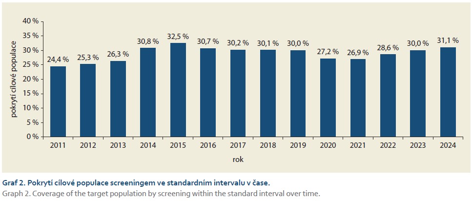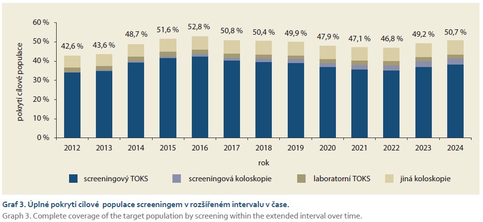 Pokrytí cílové populace kolorektálním screeningem se v letech 2011–2013 pohybovalo pod hranicí 27 %. V roce 2014 došlo k výraznému nárůstu nad 30 % v důsledku zavedení programu adresného zvaní, který umožnil cíleně oslovit osoby dlouhodobě se screeningu neúčastnící. V dalších letech se pokrytí stabilizovalo kolem 30 %. Pokles zaznamenaný v letech 2020–2021 souvisel s pandemií covidu-19, která významně omezila dostupnost i využívání preventivních programů. Od roku 2022 pak opět dochází k postupnému návratu k hodnotám kolem 30 %, přičemž v roce 2024 dosáhlo pokrytí 31,1 %. Časový vývoj pokrytí je znázorněn v grafu 2. Pokud by byly zohledněny i diagnostické výkony a rozšířený 3letý interval, činilo by tzv. úplné pokrytí přibližně 50 % (graf 3).