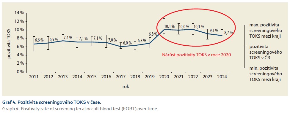 Pozitivita screeningového TOKS se do roku 2019 pohybovala okolo 6–7 %. V roce 2020 došlo k výraznému nárůstu na 10 %, přičemž pozitivita v posledních 2 letech mírně klesá, v roce 2024 činila necelých 9 %, jak je vidět v grafu 4.