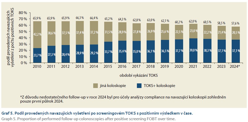 Další oblastí, která v posledních letech představovala téma k odborné diskuzi, je pozitivita screeningového TOKS. V roce 2020 došlo k výraznému nárůstu pozitivity screeningového TOKS z původních 6–7 % na 10 %. Takto vysoká pozitivita přetrvávala i v následujících letech. Nárůst pozitivity pravděpodobně souvisel se zavedením kvantitativních imunochemických TOKS vyhodnocovaných pomocí POCT přístrojů v ordinacích praktických lékařů a gynekologů. Jedním z důvodu vysoké pozitivity bylo zřejmě používání různých typů analyzátorů s rozdílnými výsledky stanovení hemoglobinu ve stolici. Zvýšená pozitivita TOKS v roce 2020 vedla k prodloužení čekacích dob na navazující TOKS+ koloskopii, které se postupně ustálily na průměrných 3 měsících. Z tohoto důvodu bylo zavedeno provádění externího hodnocení kvality (EHK) jako podmínka pro kvalitní provádění analýzy hemoglobinu ve stolici, přičemž v rámci Věstníku MZD č. 11/2023 byla vydána Úprava Věstníku MZ ČR č. 1/2009, v jejímž rámci byl tento Věstník doplněn [9]. Konkrétně byla upřesněna textace týkající se EHK, hodnota cut-off a také byla doplněna informace o každoroční povinnosti předávání souhrnných výsledků EHK na ÚZIS ČR. Je ovšem potřeba, aby výsledky této kontroly byly pravidelně monitorovány. Na začátku roku 2025 bylo vybraným lékařům rozesláno upozornění ohledně pozitivity screeningového TOKS v jejich ordinaci. Zároveň bylo zjišťováno, zda je u lékařů prováděno EHK. Dalším slabým místem programu, které bylo zjištěno na základě dat, je nízká účast osob s pozitivním screeningovým TOKS na navazující koloskopii. Podíl osob, kterým byla provedena navazující koloskopie, dosahuje dlouhodobě přibližně 60 %.