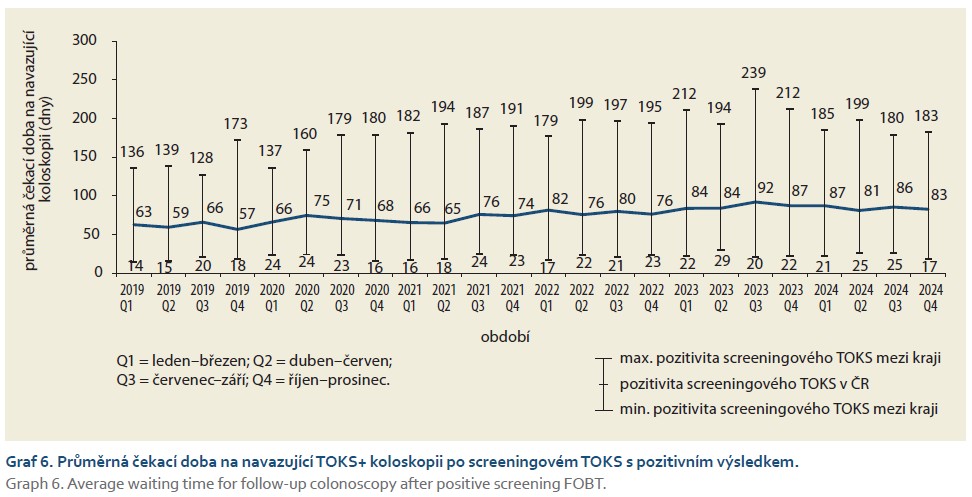 Od roku 2020 sledujeme postupný nárůst průměrné čekací doby na navazující TOKS+ koloskopii po pozitivním screeningovém TOKS. V posledních kvartálech se průměrná čekací doba ustálila okolo 3 měsíců (graf 6). V posledním kvartále roku 2024 odpovídala průměrně 83 dnům.