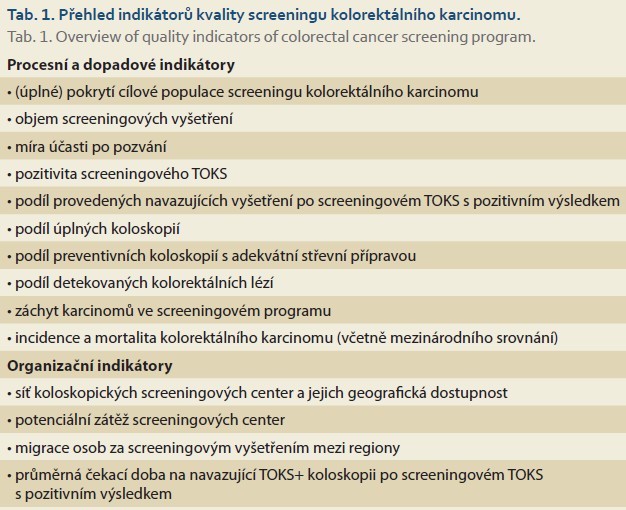 V rámci hodnocení screeningu KRK je sledována široká škála procesních, dopadových i organizačních indikátorů, které umožňují komplexně posoudit fungování programu i jeho výsledky. Nastavení programu a jeho monitoring je v souladu s oficiálními evropskými doporučeními [8]. Indikátory je možné sledovat nejen na celorepublikové úrovni, ale také na úrovni jednotlivých poskytovatelů zdravotní péče. Přehled základních sledovaných indikátorů v rámci screeningu KRK je uveden v tab. 1.