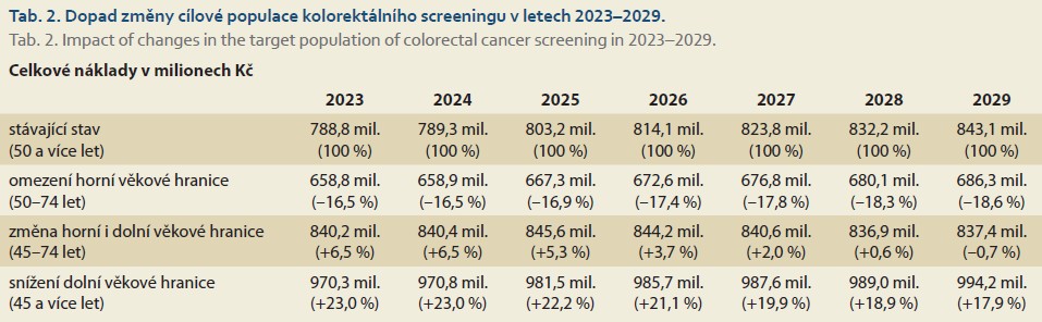 Jak však vyplývá z predikce středního vývoje populace od Českého statického úřadu, populace bude postupem času stárnout, což bude mít při srovnání stejných věkových kategorií opačný výsledek a počet vyšetřených osob bude v roce 2029 vyšší u věkové kategorie 50 a více let. Právě stárnutí populace se projeví i na vývoji celkových nákladů vynaložených na screeningové TOKS, preventivní koloskopie a navazující terapeutické výkony. V prvních letech po zavedení věkového intervalu 45–74 let by mělo dojít k navýšení nákladů o 5–6 % oproti situaci, kdy by zůstal věkový interval 50 a více let. V roce 2029 by však měl být trend opačný a celkové náklady budou o 0,7 % nižší. Podrobnější informace jsou k nahlédnutí v tab. 2.