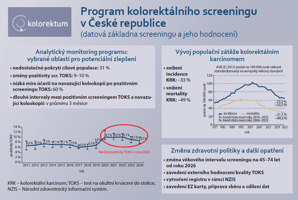 Úvod: Screening kolorektálního karcinomu (KRK) je klíčovým nástrojem sekundární prevence, jehož efektivita závisí na účasti populace, dostupnosti péče a kvalitě prováděných vyšetření. Jeho účinnost je podmíněna také systematickým sběrem a analýzou dat. Kvalitní data jsou klíčovým pilířem pro monitoring probíhajícího screeningu, jeho evaluaci a identifikaci slabých míst programu. Cílem je ukázat přínos dat pro optimalizaci programu v ČR na příkladu dvou případových studií. Metody: Byly využity datové zdroje Národního zdravotnického informačního systému a Databáze preventivních koloskopií spravované Ústavem zdravotnických informací a statistiky ČR, doplněné o sociodemografická data z Českého statistického úřadu. Hodnocení proběhlo pomocí indikátorů kvality screeningu a budget impact analýzy zaměřené na změnu věkových hranic screeningu. Výsledky: První případová studie ukazuje pokles incidence KRK o 33 % a mortality o 49 % od zavedení programu. Pokrytí cílové populace se dlouhodobě pohybuje okolo 30 %. V roce 2020 došlo k nárůstu pozitivity testu na okultní krvácení do stolice (TOKS) na 10 %. Interval mezi pozitivním TOKS a navazující koloskopií odpovídá 3 měsícům. Míra účasti na navazující koloskopii po pozitivním TOKS činí 60 %. Druhá případová studie odhalila, že změna věkového intervalu na 45–74 let povede zpočátku k 5–6% nárůstu nákladů, avšak od roku 2029 lze očekávat jejich snížení. Diskuze: První studie ukazuje úspěch screeningu v poklesu incidence a mortality. Současně identifikuje výzvy v podobě nízkého pokrytí, vysoké pozitivity TOKS, dlouhých čekacích dob na navazující koloskopii a nízké účasti na navazující koloskopii po pozitivním TOKS. V druhé studii bylo zjištěno, že změna věkového intervalu bude ekonomicky efektivní. Data potvrzují přínos screeningu pro populační zdraví a upozorňují na oblasti, které vyžadují další pozornost. Závěr: Systematicky sbíraná a analyzovaná data jsou nezbytným pilířem hodnocení a řízení screeningových programů. Případové studie dokládají jejich využitelnost v monitorování kvality péče i při podpoře zdravotně-politických rozhodnutí.