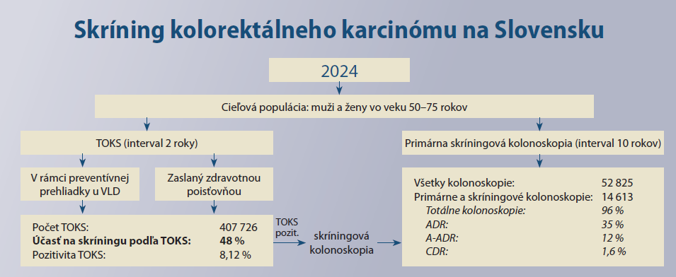 Kolorektálny karcinóm (KRCA) je celosvetovo jedným z najčastejších onkologických ochorení. Slovenská republika patrí medzi krajiny s vysokou incidenciou tohto ochorenia. Organizovaný skríning znižuje incidenciu a mortalitu na kolorektálny karcinóm. V posledných rokoch pozorujeme na Slovensku pokles vekovo štandardizovanej incidencie a mortality na toto ochorenie. Skríning rakoviny hrubého čreva a konečníka na Slovensku začal v roku 2004. Od roku 2021 bolo zavedené aktívne pozývanie časti cieľovej populácie, ktorá počas posledných dvoch rokov skríning nepodstúpila. Cieľovou populáciou pre skríning KRCA na Slovensku sú osoby vo veku 50–75 rokov s bežným rizikom ochorenia. Skríning sa vykonáva imunochemickým testom na skryté krvácanie do stolice v dvojročnom intervale v ambulancii praktického lekára alebo primárnou skríningovou kolonoskopiou raz za 10 rokov. Od zavedenia aktívneho pozývania pozorujeme nárast počtu vykonaných testov na skryté krvácanie a nárast počtu skríningových i diagnostických kolonoskopií v cieľovej populácii. Najzávažnejším problémom v programe skríningu KRCA na Slovensku je nedostatok relevantných dát na hodnotenie jeho efektivity a zabezpečenie hodnotenia kvality.