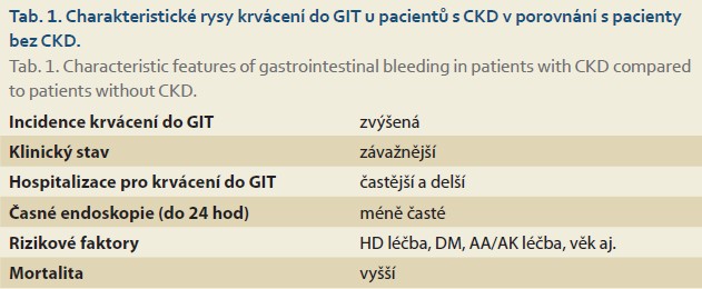 Na podkladě dostupných recentních dokladů lze uzavřít, že pokročilé fáze CKD a zvl. CHSL představují významné nezávislé faktory pro krvácení do GIT. Specifickým nezávislým faktorem pro krvácení do GIT je pravidelná hemodialyzační léčba. Krvácení do GIT u těchto pacientů má za následek zvýšenou frekvenci a délku hospitalizací a zvýšenou mortalitu (tab. 1).