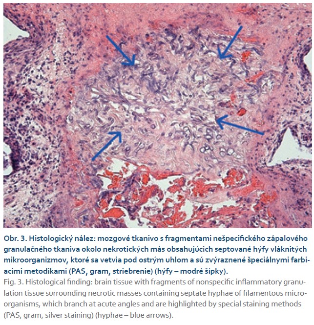 In quick succession, we conducted an ophthalmological consultation during hospitalization, which confirmed amaurosis in the right eye and optic disc edema. The consulting neurologist recommended initiating anti-edema and analgesic treatment and arranging a neurosurgical consultation. Given the unruined possibility of infection, we concurrently initiated empirical antibiotic and antifungal therapy (amphotericin B). An ENT consultation ruled out the presence of a focus in the paranasal sinuses. A complete serological workup, including galactomannan testing, was negative in the patient. After consultation with a neurosurgeon, we performed MR spectroscopy, which raised suspicion of an abscess involving the leptomeninges. Given this finding, the patient was referred to the Neurosurgery Department for histological sampling of the described lesion. Upon receiving the histological results, we definitively diagnosed the condition as a fungal brain infection caused by Aspergillus spp. (Fig. 3).
