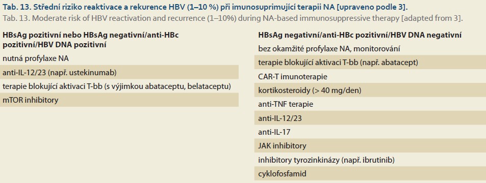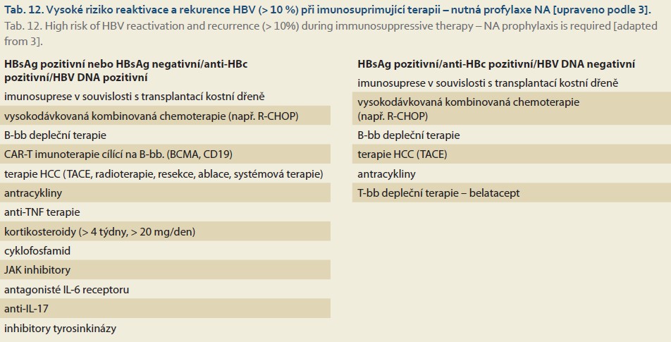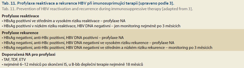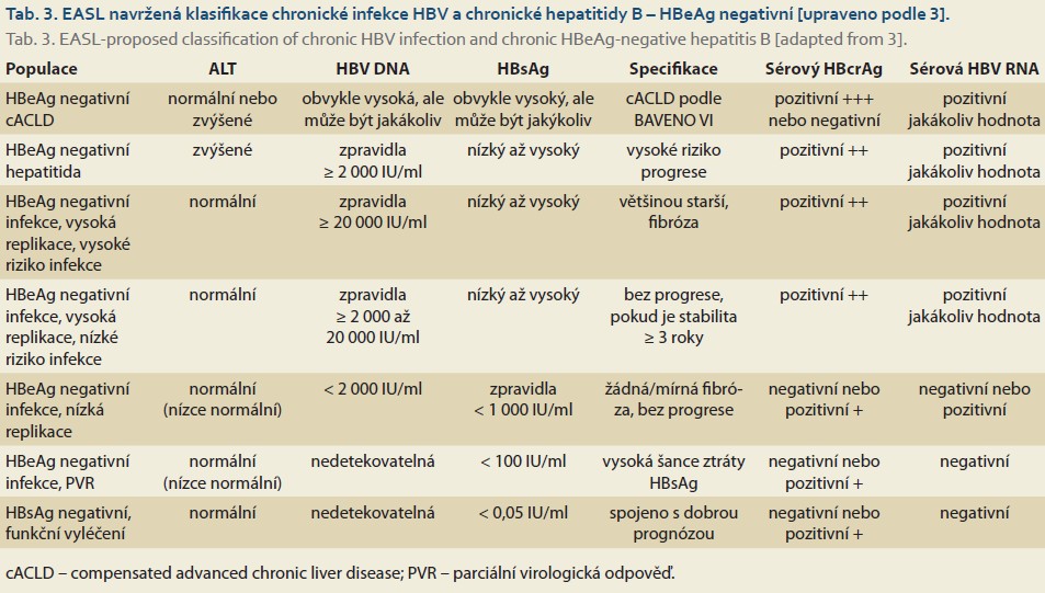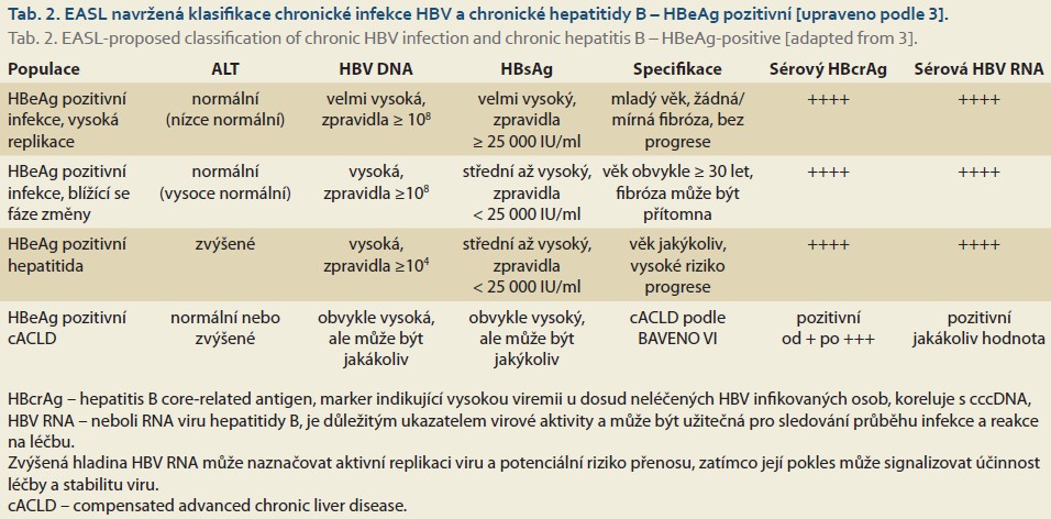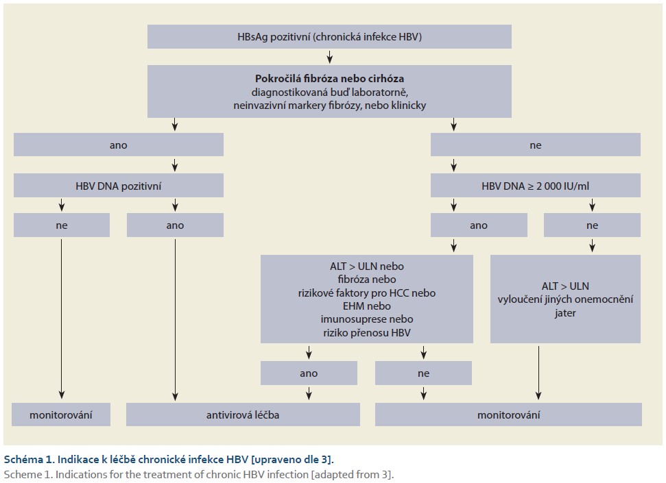 The new recommendations reflect the increase in knowledge that has been reported since the release of previous Czech guidelines in September 2017. The base for these guidelines were European Association for the Study of the Liver (EASL) guidelines from May 2025. According to qualified estimates, there are 254 million people with chronic hepatitis B (HBV) infection worldwide. The Czech Republic is among the countries with a low prevalence of HBV infection. HBV infection can cause serious, life-threatening liver damage – fulminant hepatitis, liver cirrhosis, and hepatocellular carcinoma (HCC). The main goal of treatment is to prolong life and improve its quality by preventing the progression of chronic hepatitis to liver cirrhosis, decompensation of cirrhosis, and the development of HCC. A prerequisite for achieving this goal is sustained suppression of HBV replication. Other treatment goals include preventing vertical transmission of infection from mother to newborn, preventing HBV reactivation, treating extrahepatic manifestations (EHM) of HBV, and reducing the likelihood of HBV transmission between individuals. In general, there are two possible strategies for treating chronic hepatitis B: treatment with nucleos (t) ide analogues (NAs) or pegylated interferon alfa. Currently, the vast majority of patients in the Czech Republic and throughout Europe are treated with NAs. Entecavir (ETV), tenofovir disoproxil fumarate (TDF), or tenofovir alafenamide (TAF) should be used as first-line NAs. The main advantage of treatment with highly effective NAs with a high genetic barrier to resistance is predictably high and long-term antiviral efficacy leading to undetectable HBV DNA in serum in the vast majority of adherent patients and the favorable safety profile of these drugs. These NAs can be used to treat any patient with chronic hepatitis B and are the only treatment option for patients with decompensated liver cirrhosis, after liver transplantation, with EHM HBV infection, severe acute hepatitis B, or exacerbation of chronic hepatitis B. When deciding between ETV, TDF, and TAF, it is necessary to assess comorbidities (especially renal insufficiency and bone density reduction) and other factors (women of childbearing age, pregnant women, older age).