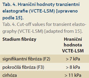 The Baveno VI conference introduced the term “compensated advanced chronic liver disease – cACLD” for patients with advanced liver fibrosis or early cirrhosis who are asymptomatic but at risk of developing clinically significant portal hypertension (CSPH) and progression of liver disease. Liver stiffness < 10 kPa is a safe cutoff for ruling out cACLD, and stiffness > 15 kPa is highly suggestive of cACLD. In individuals with liver stiffness < 20 kPa and a platelet count > 150,000, the likelihood of developing high-risk varices and bleeding from them is low; therefore, preventive gastrofibroscopic examination is not necessary [16,17]. The VCTE-LSM cutoff values are listed in Table 4.