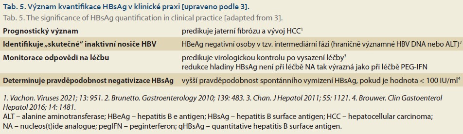 Quantitative determination of serum HBsAg concentration cannot replace HBV DNA quantification, but it provides additional important information regarding the determination of the stage of chronic HBV infection and, in particular, the assessment of the risk of discontinuing treatment before HBsAg clearance [18]. The significance of HBsAg quantification is evident from Table 5.