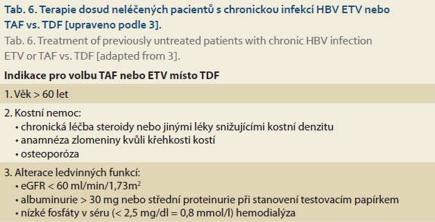 - When deciding between ETV, TDF, and TAF, comorbidities (primarily renal insufficiency and reduced bone density) and other factors (women of childbearing age, pregnant women, older age) must be evaluated (Table 6) .