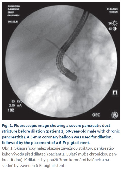- patient 1: a tight pancreatic duct stricture was managed with a 3- mm coronary balloon, followed by a 6-Fr pigtail stent;