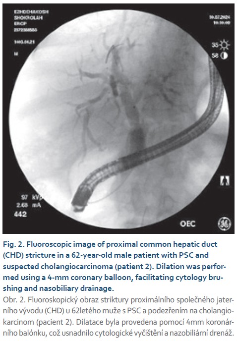 - patient 2: proximal hepatic duct dilation was achieved with a 4- mm coronary balloon, enabling brushing for cytology and nasobiliary drainage;
