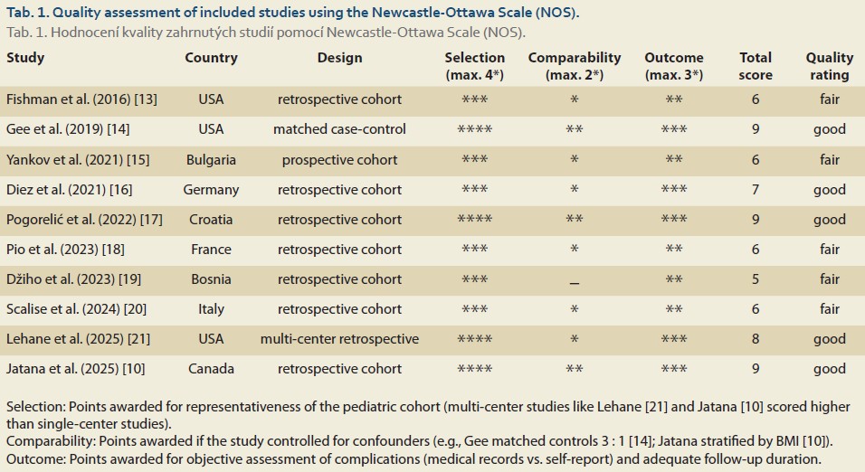 As the included studies were all non-randomized observational studies, the Newcastle-Ottawa Scale (NOS) was employed to assess methodological quality. Studies were scored across three domains: Selection (representativeness of the cohort), Comparability (control for confounding factors), and Outcome (assessment and follow-up). Studies scoring ≥ 7 stars were considered “Good” quality; 4–6 stars, “Fair”; and < 4 stars, “Poor” (Tab. 1).