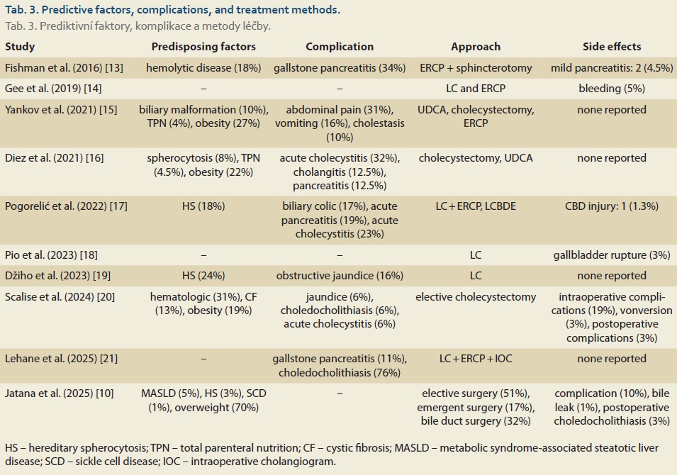 Pain, vomiting, fever, and jaundice were common clinical findings. More serious complications included choledocholithiasis (14.5%), acute cholecystitis (10.5%), and acute pancreatitis (6.0%). Predisposing factors are detailed in Tab. 3. Obesity was a major factor, with a prevalence of 70.0% in one study [10]. Other factors included hereditary spherocytosis, total parenteral nutrition, biliary malformations, and hematologic diseases. Yankov et al. [15] reported that UDCA was more successful in children with a history of dehydration and stones < 5 mm in diameter.